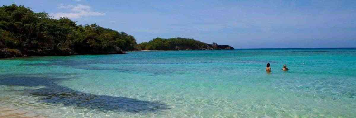 The road heading up to the beach is long and unpaved which leads to a wide, white sandy beach which stretches along a sheltered bay with thick groups of trees and vines providing good shade and acts as a backdrop to the aquamarine water filling the foreground.